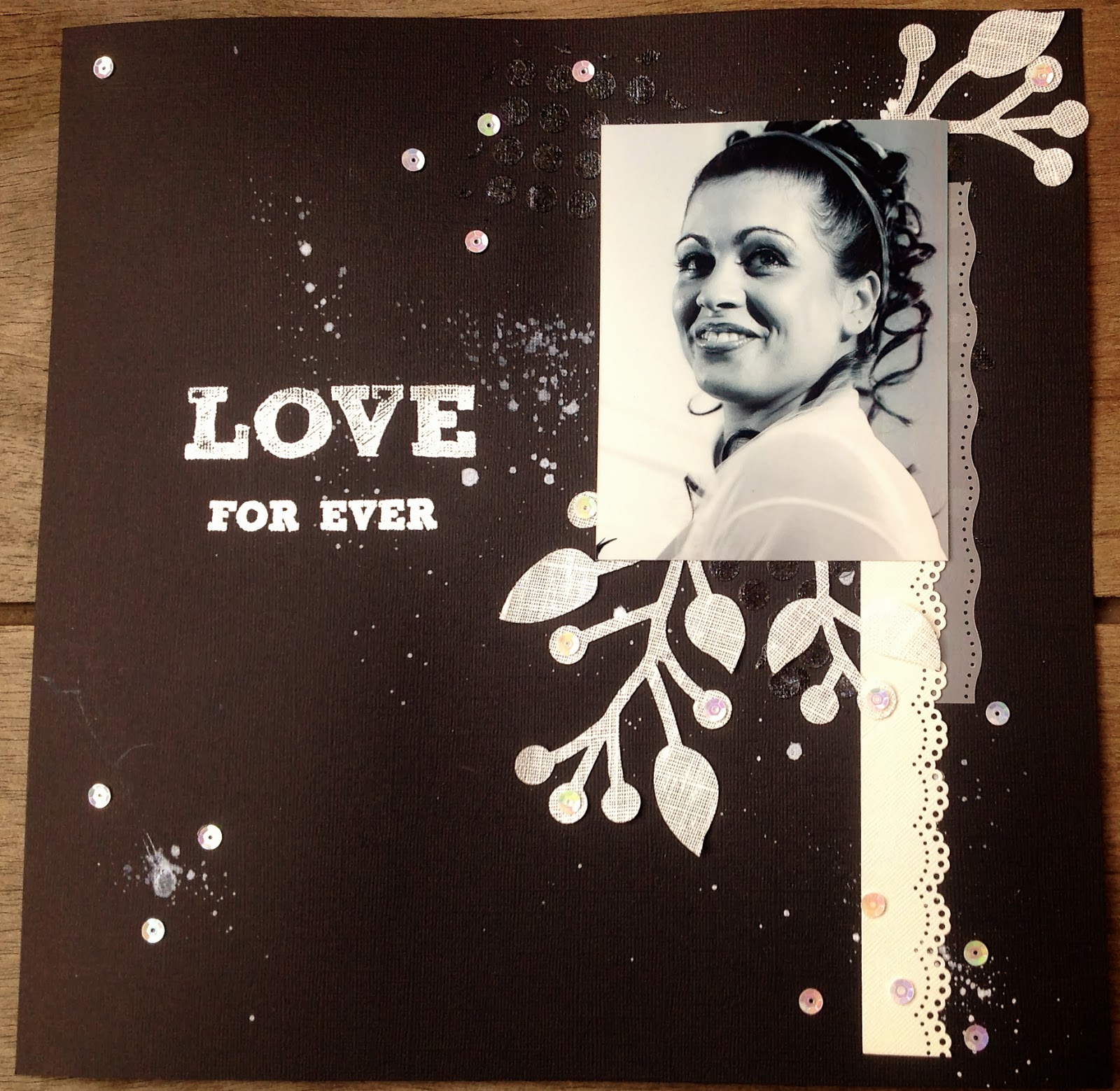 Ho utilizzato del lino bianco nel quale ho fustellato il ramo con le foglie, una piccola striscia di vellum e una di bazzil avorio. Ho spruzzato della china bianca sul bazzil, sotto la foto ho utilizzato uno stencil a pois grandi e del decoglass polvere di luna che asciugandosi è diventato trasparente perlescente. Dalla foto si vede poco ma l'effetto mi piace tantissimo! Ho aggiunto poi qualche paillettes bianca perlescente per dare un tocco di luce qua e là!